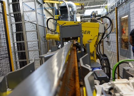 It is a continuous process, and the machine is equipped with a fully automatic handling system for loading and offloading finished rails. A new production hall has been built to house the milling machine. The milling machine is certified by an authorized body (KIWA) and meets the official Dutch specifications ‘Prefab milled, ground or planed rails’.