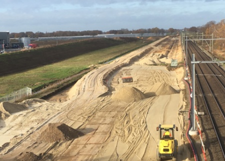 Bij de bouw van een aansluiting voor een railterminal komt meer kijken dan alleen de aanleg van spoor, zoals civiele werkzaamheden. Denk bijvoorbeeld aan het grondwerk en het inrichten van de omgeving op het gebied van leidingen en kabels. De spooraanleg moet telkens op precies de juiste momenten gebeuren zodat het de overige werkzaamheden niet in de weg zit en het project gestaag voort kan gaan. In juni en november van dit jaar vindt de aansluiting aan het spoor Eindhoven- Venlo pas plaats, maar een deel van de spoorstaven en andere spooronderdelen worden dus nu alvast klaargelegd om in de vrije ruimte voorgebouwd te kunnen worden en in de twee grote buitendienststellingen op het hoofdspoor aangesloten te kunnen worden. Op deze manier kunnen onze collega’s ook weer een keertje overdag werken, in plaats van ’s nachts tijdens de buitendienststellingen. Wel zo verfrissend.